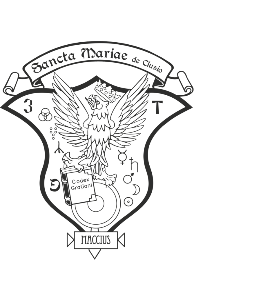 Figura fissa: un’aquila color argento su scudo color oro come da insegna militare di legione romana con sulla targa scritto in nero e caratteri romani “MACCIUS”. L’aquila ha il rostro incurvato aperto con lingua sporgente e tiene la testa voltata a destra, con zampa destra reggente tomo di color ocra chiaro sulla cui copertina è scritto il caratteri romani in oro filato di nero :”Codex Gratianii” e sulla testa porta corona di duca cimata con otto fioroni (cinque visibili) sostenuti da punte a base con pietre preziose. Le ali sono aperte, sopra lo scudo listello svolazzante color pergamena con scritto in caratteri romani neri: ”Sancta Mariæ de Clusio” . Sullo sfondo dello stemma si possono individuare i seguenti simboli: numero radicale planetario, i tre anelli degli Anelleschi, Fortuna Major (Stabilità), Runa YR (la terra), Xvii Arcano (Le Stelle), Mercurio (Commercio), Saturno (Saggezza e Disciplina), Marte (Forza), Luna, Sole e il Tau (simbolo dei Cavalieri di Altopascio).